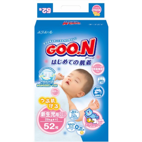 グーン はじめての肌着 新生児 52枚 みるみる吸収シートと便ポケットがゆるゆるウンチをキャッチする紙おむつ 新生児用です。【日用品屋】グーン はじめての肌着 新生児 52枚【※キャンセル・変更不可】